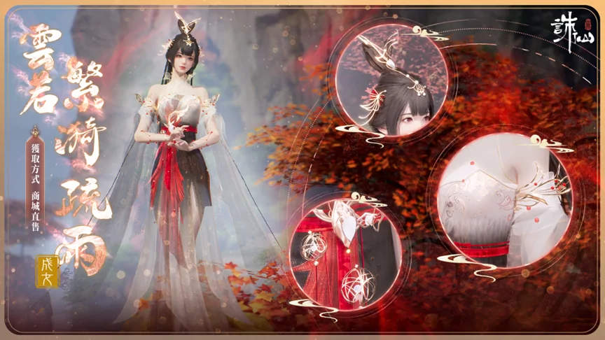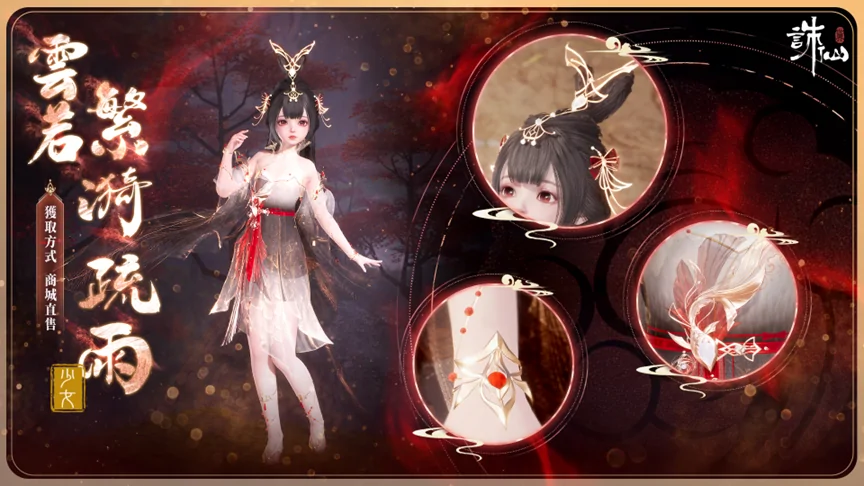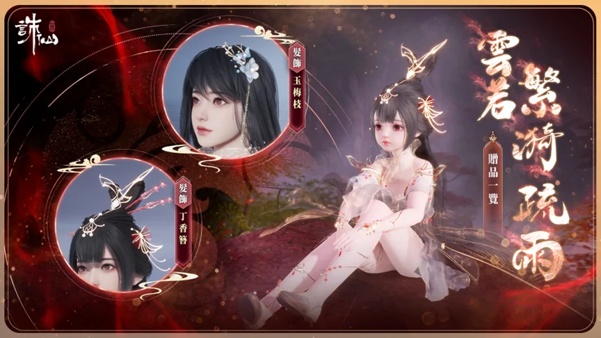 商城直售【雲若‧繁漪疏雨】套裝將於9月3日維護後上架,售價1680古玉。購買套裝還可獲得贈品掛件【丁香簪】與【玉梅枝】。