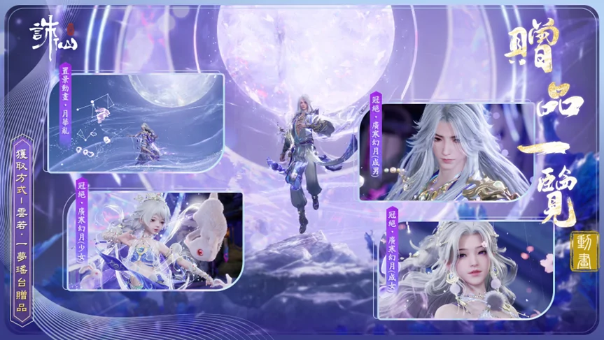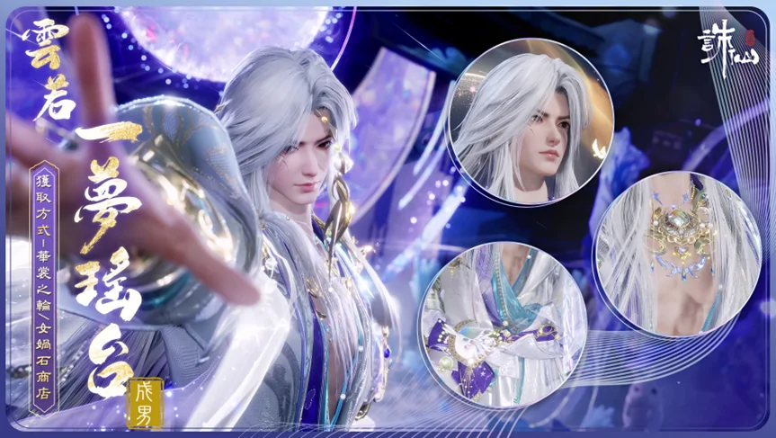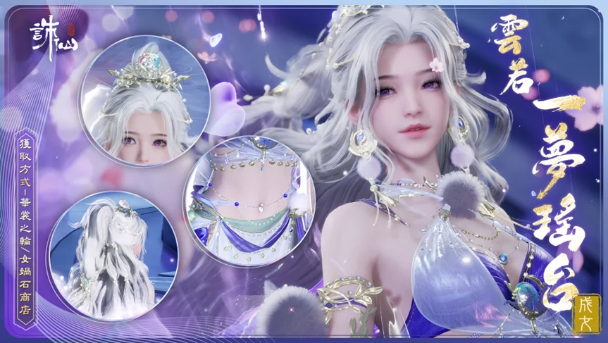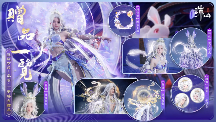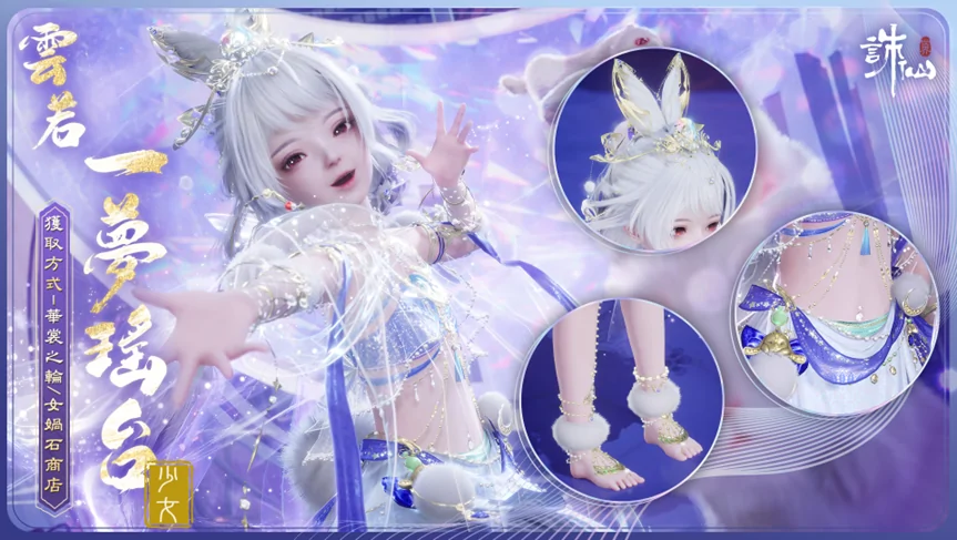 華裳之輪新增主題時裝禮包【雲若·一夢瑤台】,也可消耗2顆女媧石在女媧石商店兌換獲得。【雲若·一夢瑤台】主題時裝禮包包含時裝【雲若·一夢瑤台】、環身特效【霜月瓊光·身】,【懸掛·銀河月影】、【發飾·月魄靈音】、置景動畫【月華亂】、結算動畫【冠絕·廣寒幻月】、個人主頁展示動作【步清虛】、【頭像·一夢瑤台】、【頭像框·蟾宮寄願】。