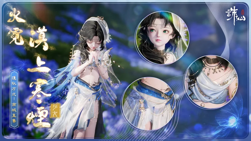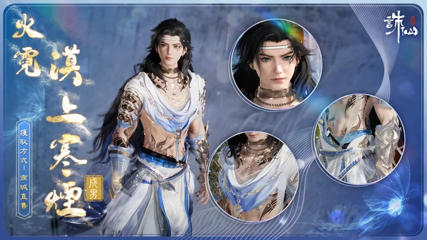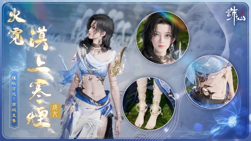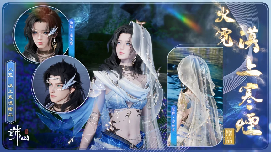 商城直售上架時裝【火霓·漠上寒煙】售價2280古玉,購買【火霓·漠上寒煙】可獲得贈品【面飾·遠風塵】【髮飾·沙如雪】。並可在成就中取得免費易容券*1,彩玉*5。
