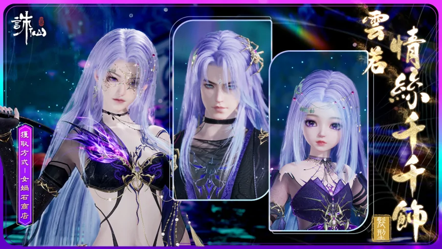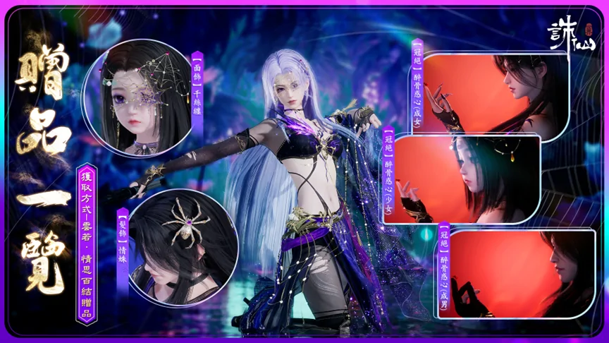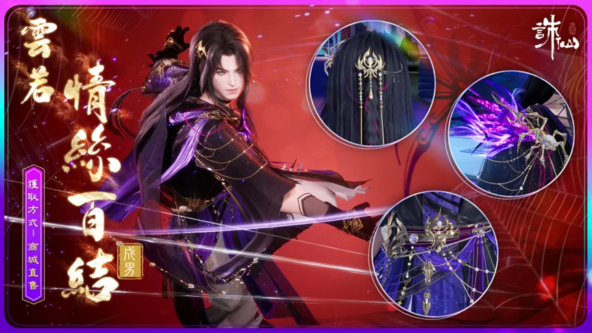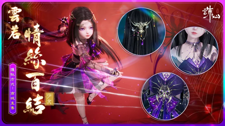塵網牽纏因有恨,情絲百結本無心。購買【雲若情絲百結】可獲贈:【面飾·千絲纏】、【髮飾·情蛛】、冠絕動畫【冠絕·醉骨惑心】。