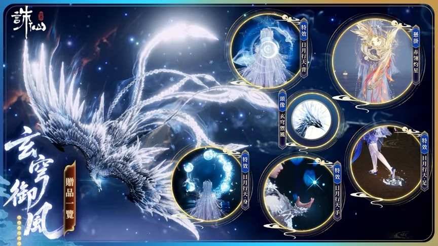 解鎖【玄穹禦風】(銀色)即可獲得贈品掛件【懸掛·赤翎灼星】、頭像【玄穹禦風】、環身特效【日月行天·身】、背部特效日【日月行天·背】、手部特效【日月行足【手】、天效