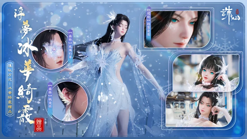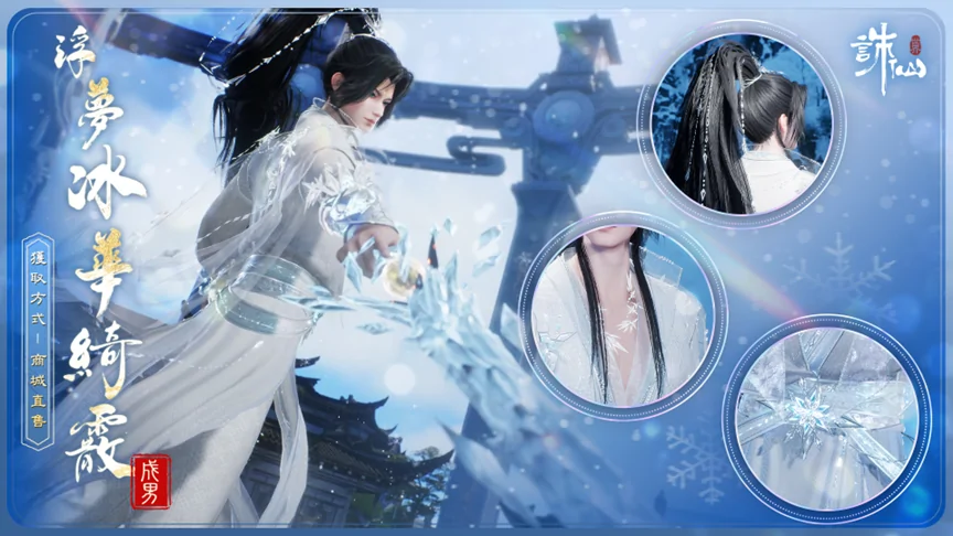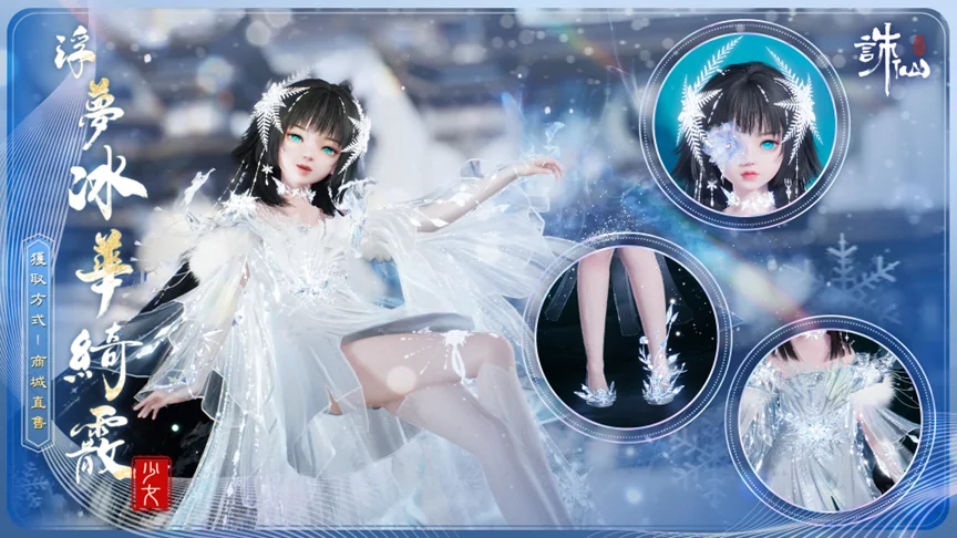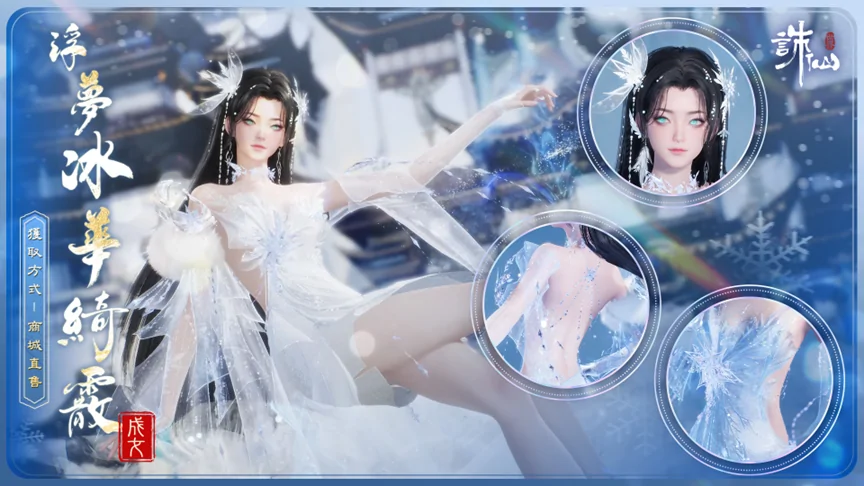 商城直售上架時裝【浮夢·冰華綺霰】售價2880古玉,購買【浮夢·冰華綺霰】可獲得贈品掛件【面飾·琉璃幻華】及【面飾·鶴飛羽】。並可在成就中領取結算動畫【冠絕·踏雪凌霜】。