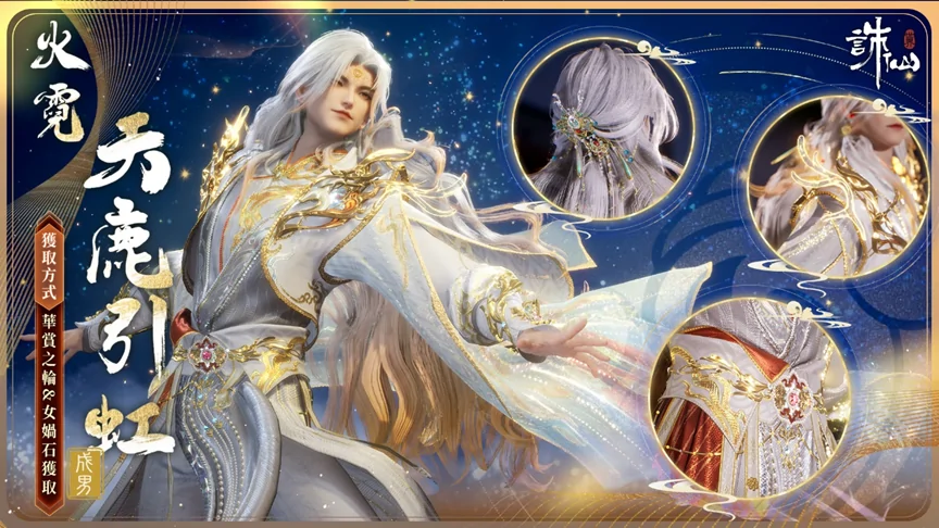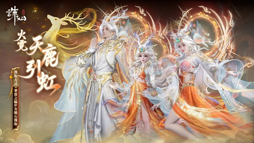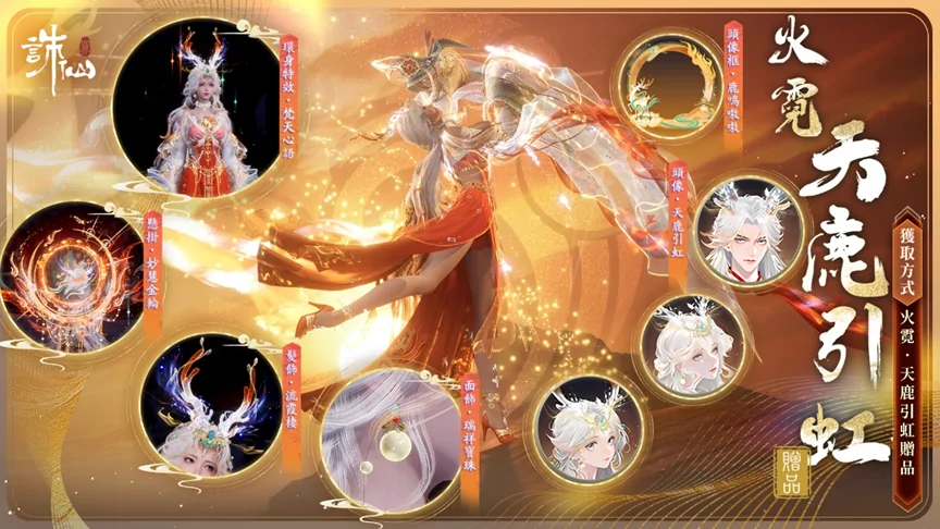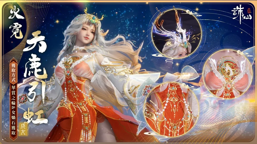 華裳之輪新增主題時裝禮包【火霓·天鹿引虹】,也可消耗2顆女媧石在女媧石商店兌換獲得。 【火霓·天鹿引虹】主題時裝禮包包含時裝【火霓·天鹿引虹】、環身特效【梵天心語·身】,【懸掛·妙慧金輪】、【髮飾·流霞棲】、【面飾·瑞祥寶珠】、【置景·動畫踏金霄】、【頭相框·鹿鳴嗷嗷】、【頭像·天鹿引虹(御/淑/稚)】、【冠絕‧幻舞飛天】。