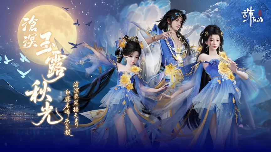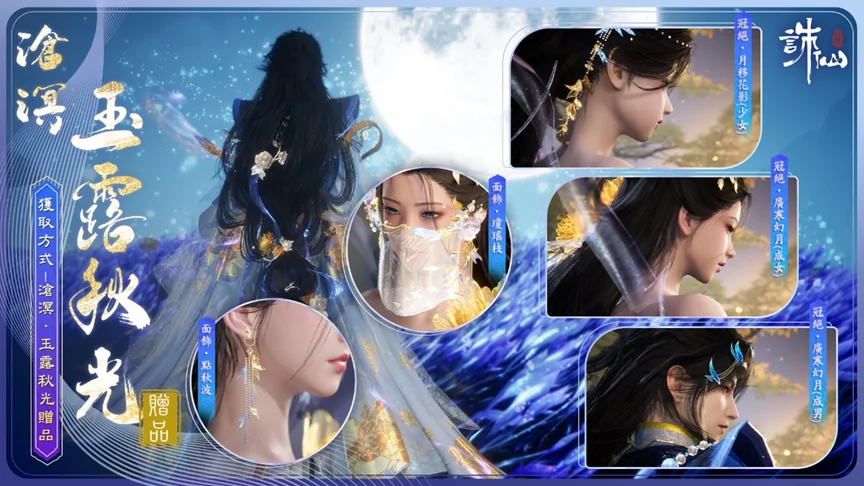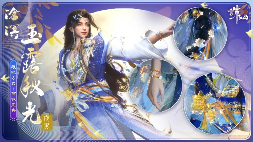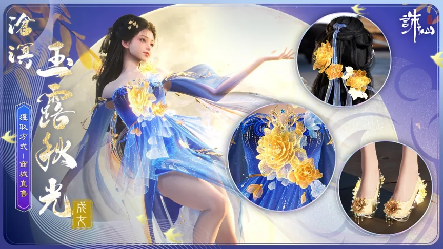 商城直售上架時裝【滄溟·玉露秋光】售價2880古玉,購買【滄溟·玉露秋光】可獲得贈品【面飾·點秋波】、【面飾·瓊瑤枝】、結算動畫【冠絕·月移花影】。