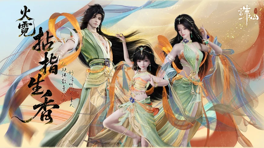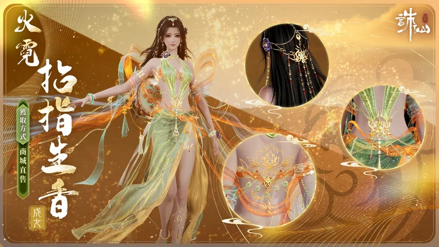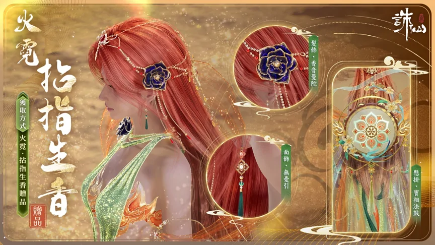 商城直售上架時裝【火霓·拈指生香】售價2280古玉,購買【火霓·拈指生香】可獲得贈品【面飾·無憂引】、【髮飾·香音曼陀】、懸掛【寶相法鼓】。